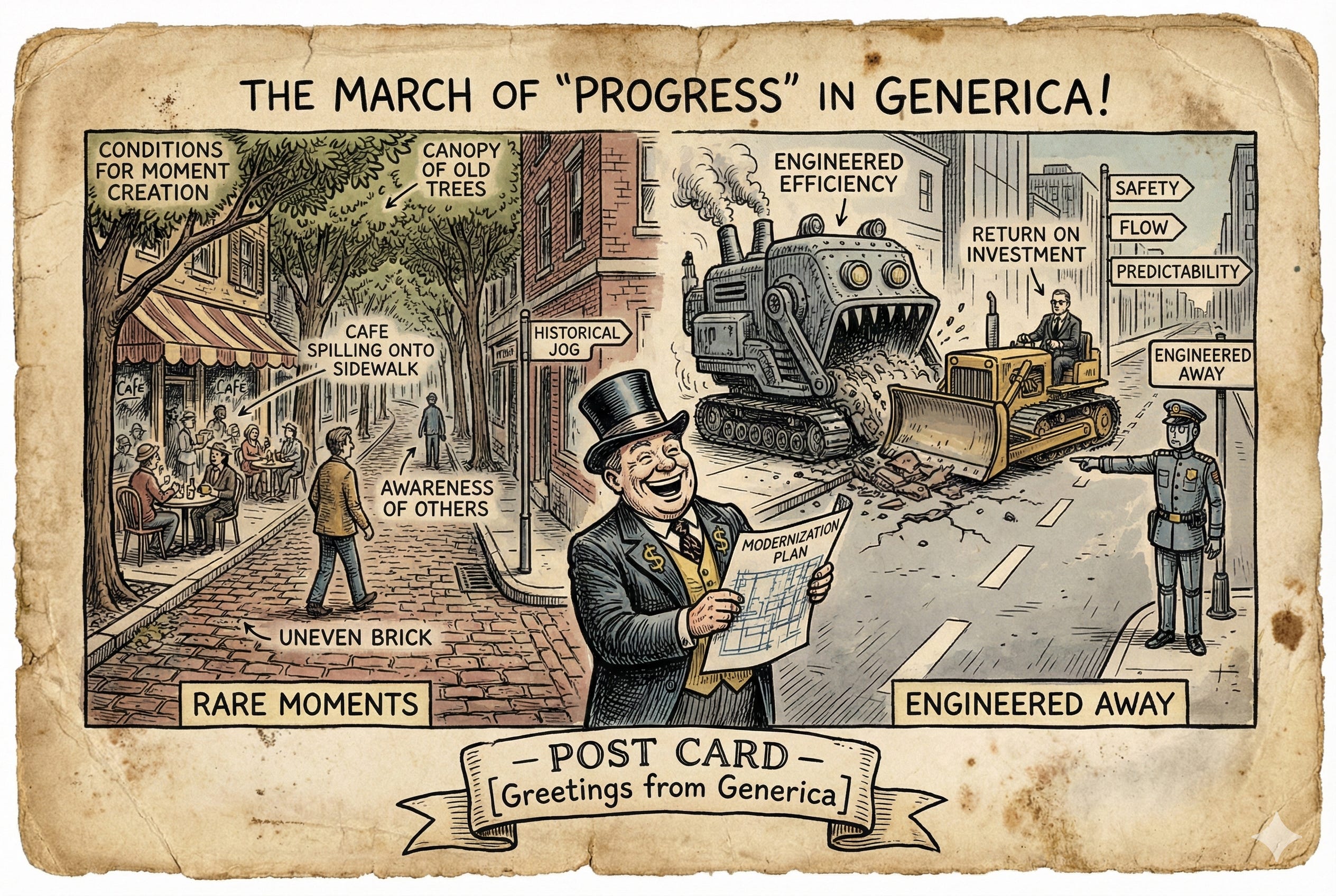 The fight to Escape Generica isn’t won with better design or stricter zoning or more funding. It’s won by protecting the moments.